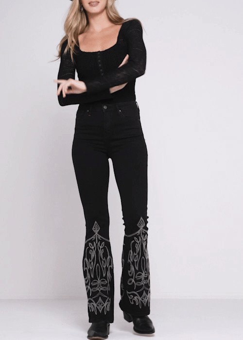 - Bootcut leg with embroidered detailing
