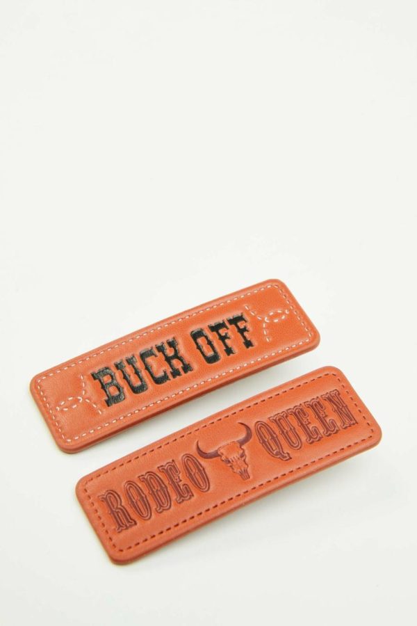 - Clip A: Brown faux leather with “Buck Off” and western stitching embossed design