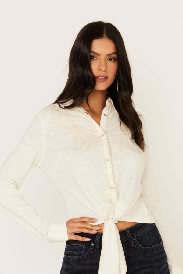 Women Idyllwind Tops | Embroidered Tie Front Knit Long Sleeve Western Snap Top