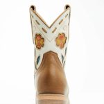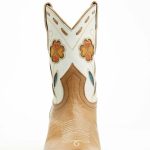 - Tan vamp and ivory shaft with multicolored floral inlay design and tan buck stitch accents