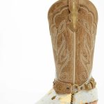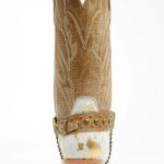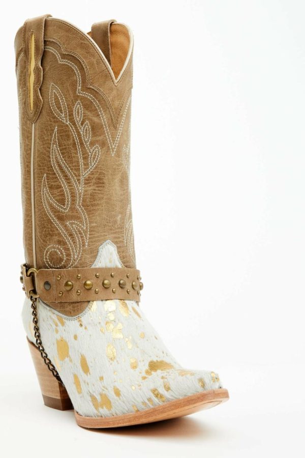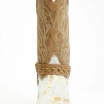 - Cream hair on hide vamp with gold acid wash accents and tan shaft with western stitching